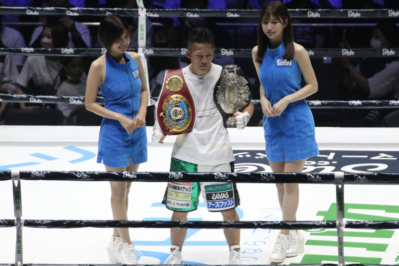 井上拓真(中央)の表彰の記念撮影で天野麻菜(左)と並ぶ雪平莉左(右)