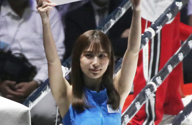 井上尚弥戦でプラカードを持つ人気グラドル雪平莉左。1ラウンド終了時のインターバル時のみ登場した。