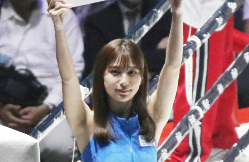 井上尚弥戦でプラカードを持つ人気グラドル雪平莉左。1ラウンド終了時のインターバル時のみ登場した。