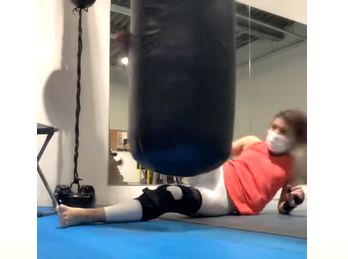 床に寝た状態で蹴りを繰り出す(『ぱんチャンネル_ぱんちゃん璃奈』)
