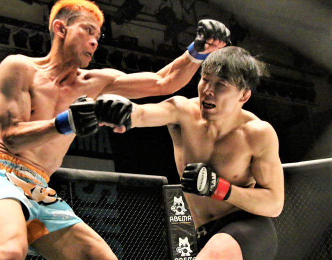 今年3月の前戦、激しい打ち合いを繰り広げる関口祐冬(右)