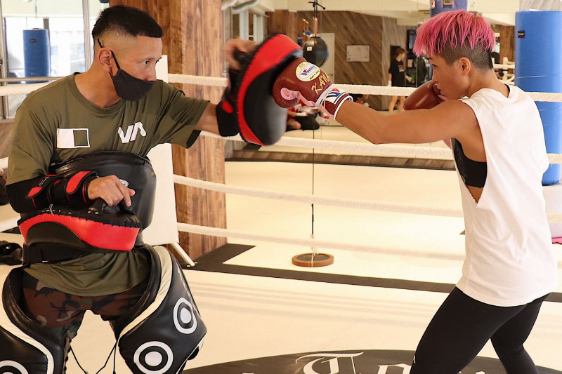 大宮司進会長の持つミットへ強烈なパンチを打ち込むKANA(C)K-1