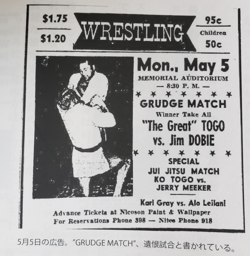 前日の5月5日にともに米国遠征していた遠藤幸吉がミーカーと柔術マッチをするという広告(海を渡った空手より)