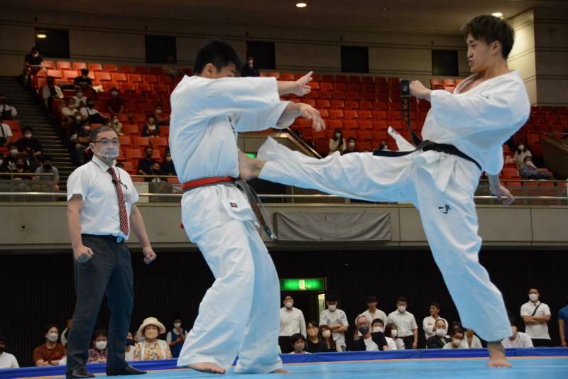 南原が豪快な前蹴りを相手のボディに突き刺す