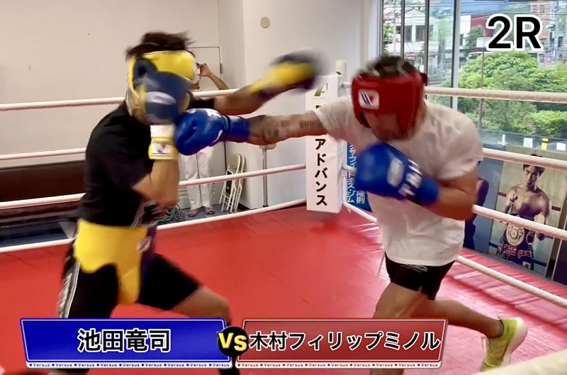 相手の左フックより素早く右ストレートを打ち込む木村 竹原テレビより