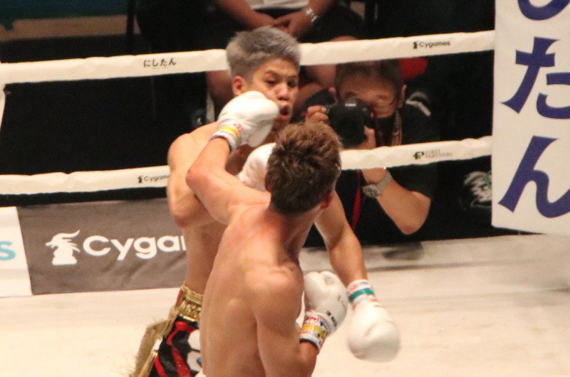 2R目の打ち合いで山崎が反撃、左フックがヒット!