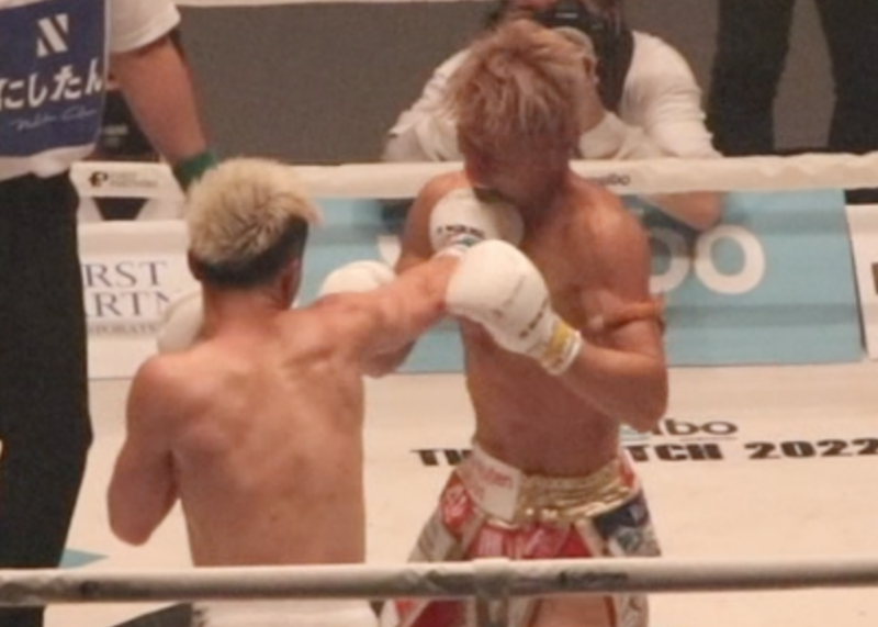 武尊のカウンターへのディフェンス1、天心の右に被弾しながら右を出す武尊