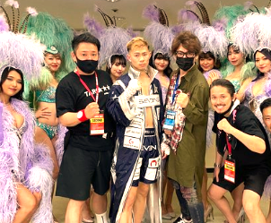 YA-MANはバーレスク東京の協力を得て美女ダンサーと入場した。前列右が宮城大樹代表(burlesque_instagram)