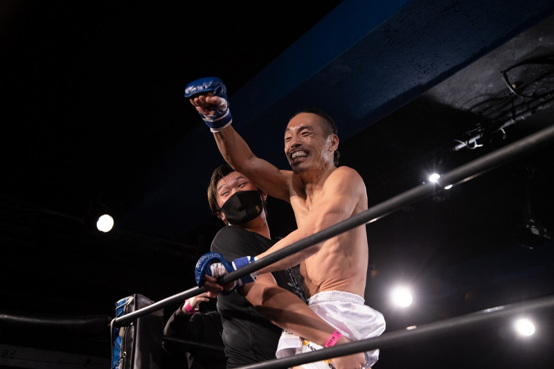 セコンドの小比類巻(左)会長と抱き合う安彦(c)RISE