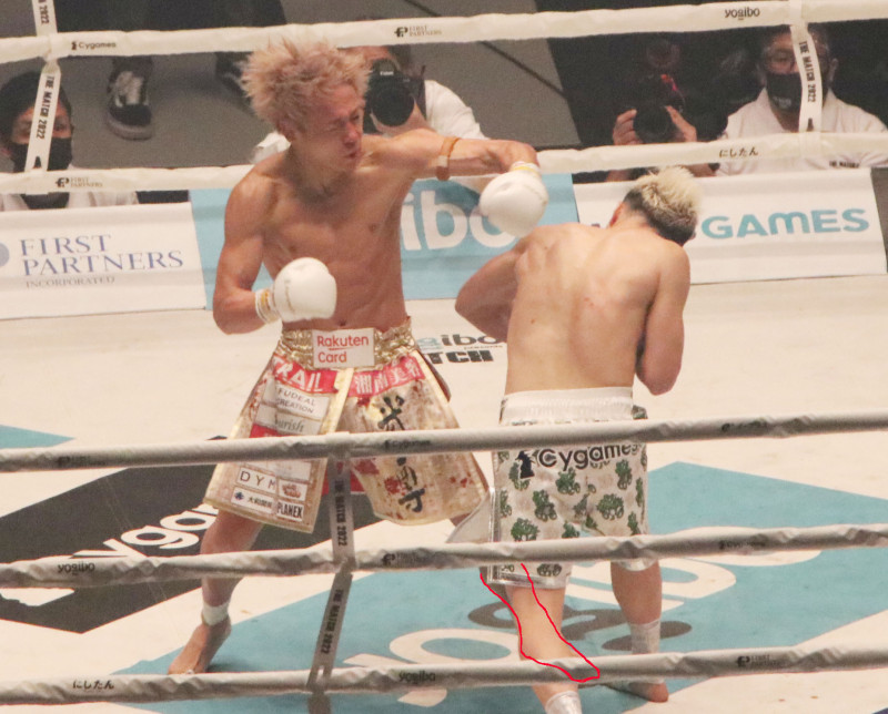 天心は前足の外側の空間に足を置き、武尊の脇の下に屈むように打った。ディフェンスを兼ねたと久保。※赤線は写真を拡大して検証した武尊の前足の位置