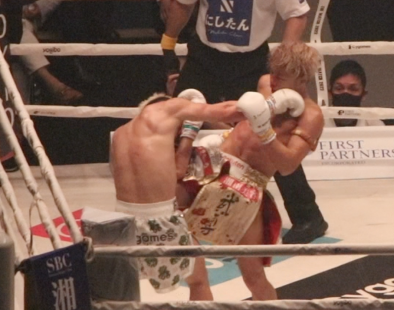 K-1はクリンチ禁止なので抱え込まない蹴りを出す武尊