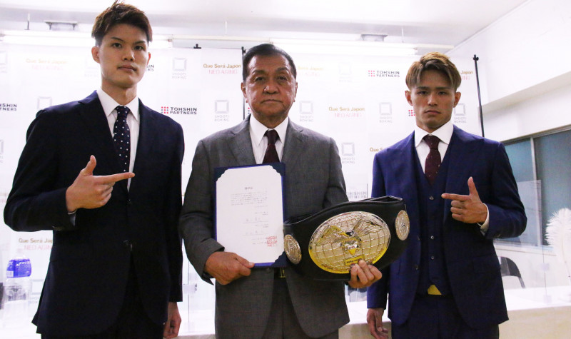 ウェルター級のベルトをかけて戦う奥山(右)と村田(左)調印式が行われた