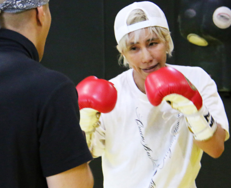 息子アーセンが持つミットに力強いパンチを打ち込む山本美憂