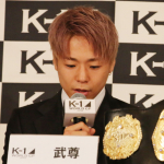 K-1のベルトを持ち登場する武尊、ベルトの返上を宣言した。