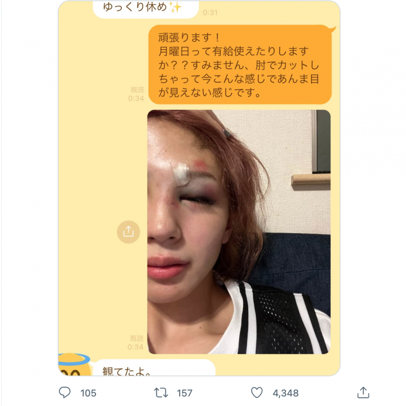 大きく顔が腫れた菅原(菅原美優Twitterより)