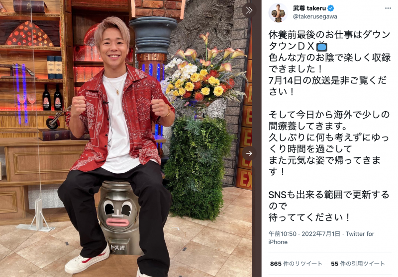 武尊が休養前の最後の仕事で笑顔戻る「ダウンタウンDX 色んな方のお陰で楽しく収録できました」武尊Twitterより