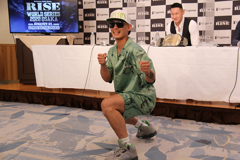 サングラスで変わったポーズで会見に現れた中野、後ろの山田は笑いをこらえきれなかった