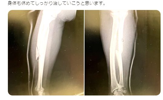昇侍公開のレントゲン写真。左写真は骨に亀裂が入っているのが分かる(昇侍Twitterより)