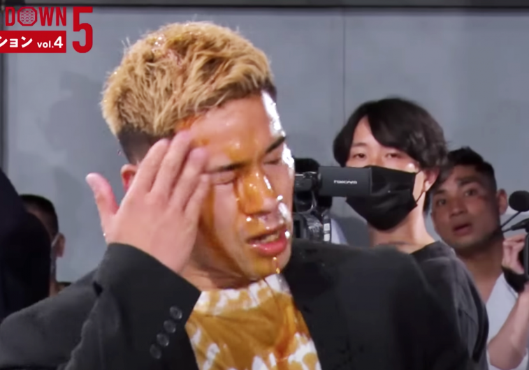 オーディションで自ら醤油をかぶり苦しそうな表情のケンカ無敗の大山田(朝倉未来YouTubeより)