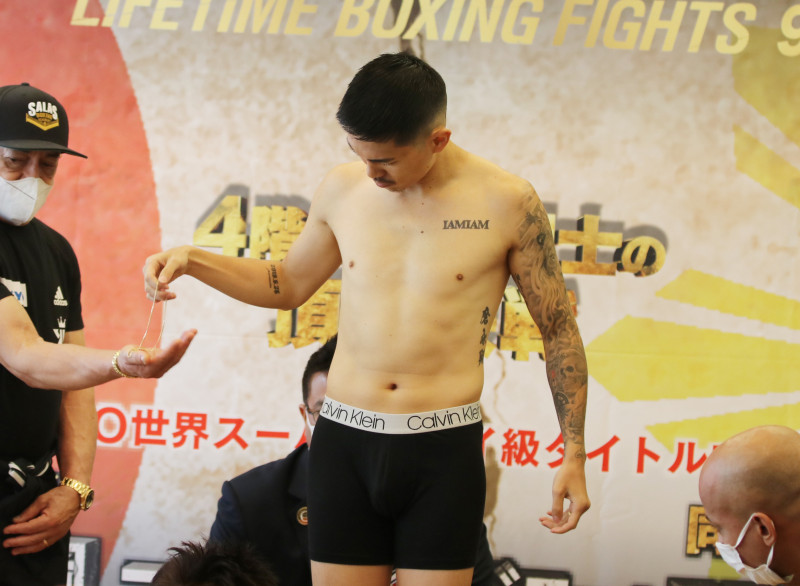 1度目の計量は40gオーバー。ネックレスをセコンドに預け体重を調整する