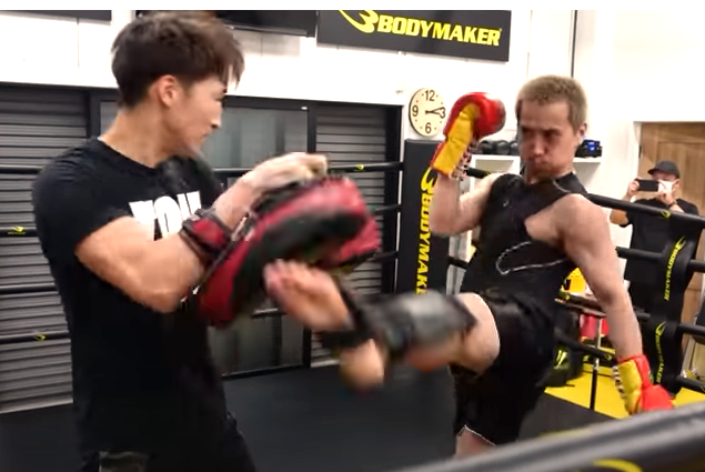 安保に左ミドルキックを教わるこめお(『安保瑠輝也 あんぽるきや』チャンネル)