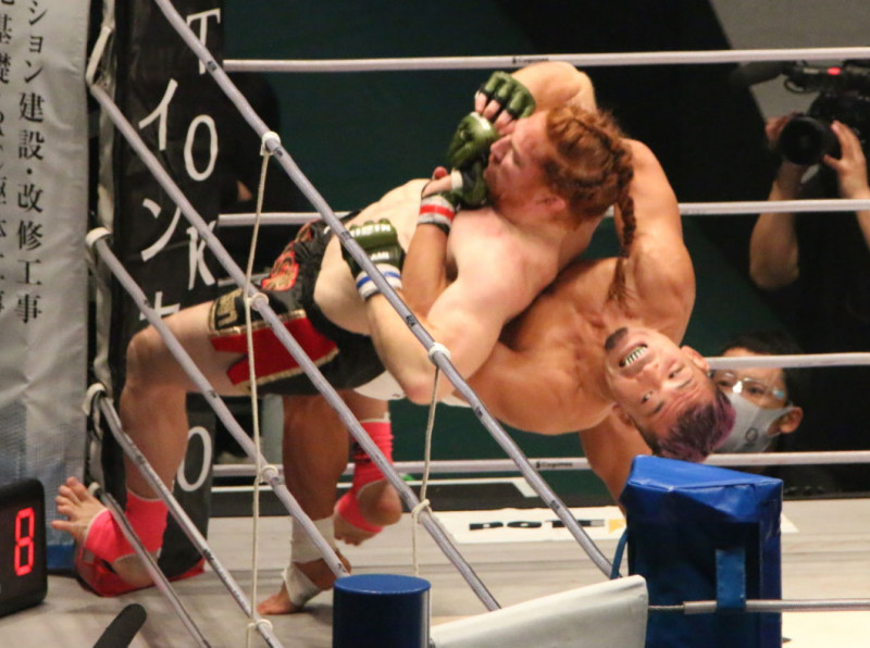 ジャーマンスープレックスを仕掛ける武田