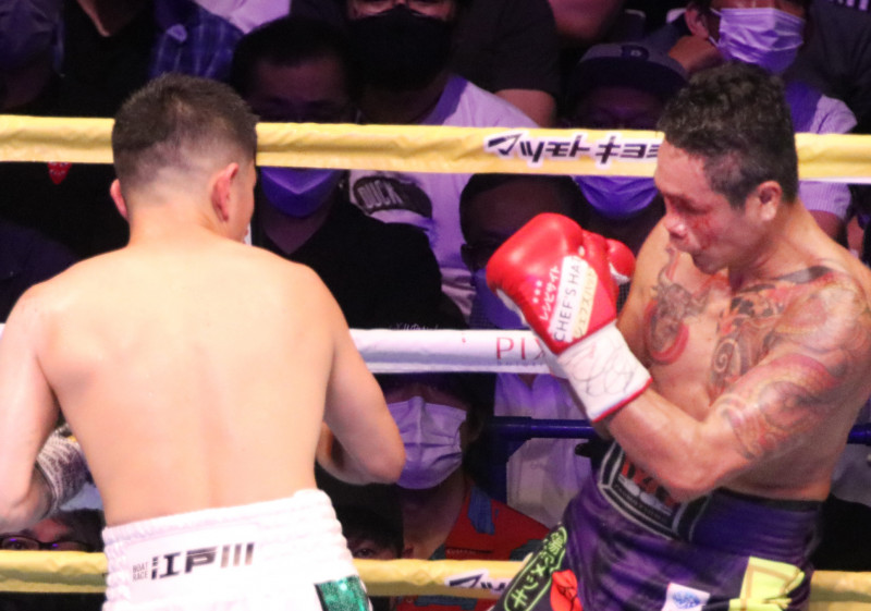 流血を呼び込む井岡の右フック=10R