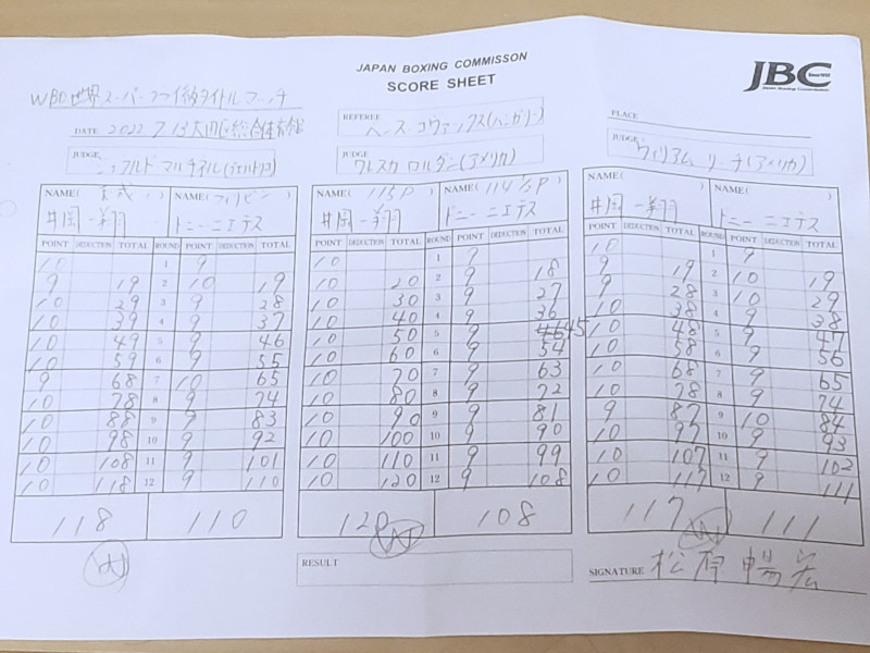 井岡vsニエテスの全ラウンドのスコアカード