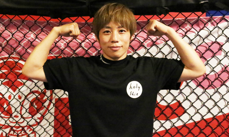 所属するAACCのバナーをバックにマッスルポーズを決める浜崎