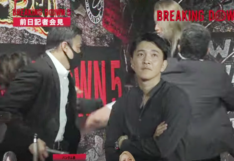 3、警備にヌンチャクを取り上げられると坂本(右)の蹴りが炸裂