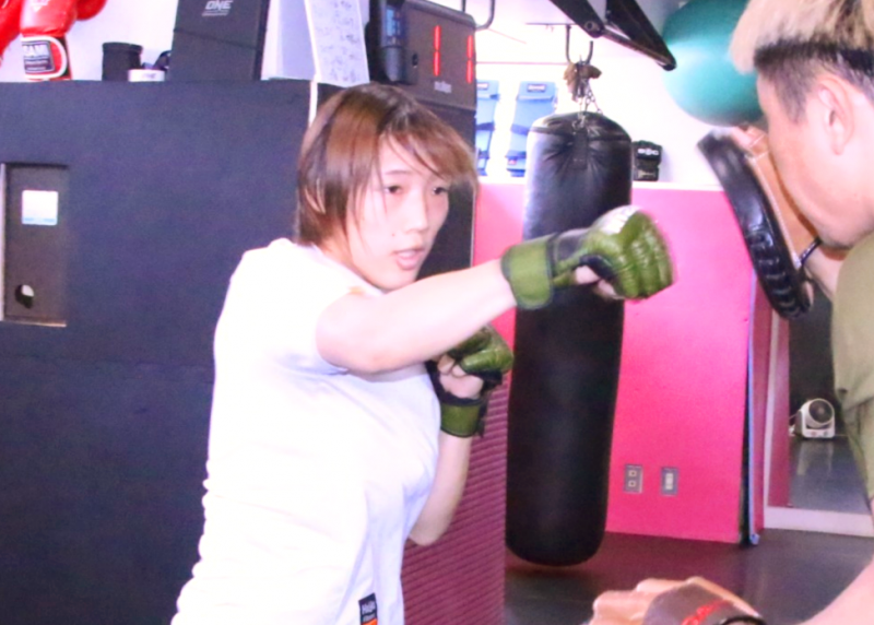 伊澤星花(左)が婚約者COROの持つミットへパンチを繰り出した