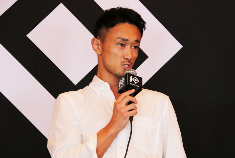 会見で「ヒジでザクザクで斬る」と語る梅野