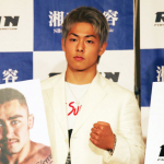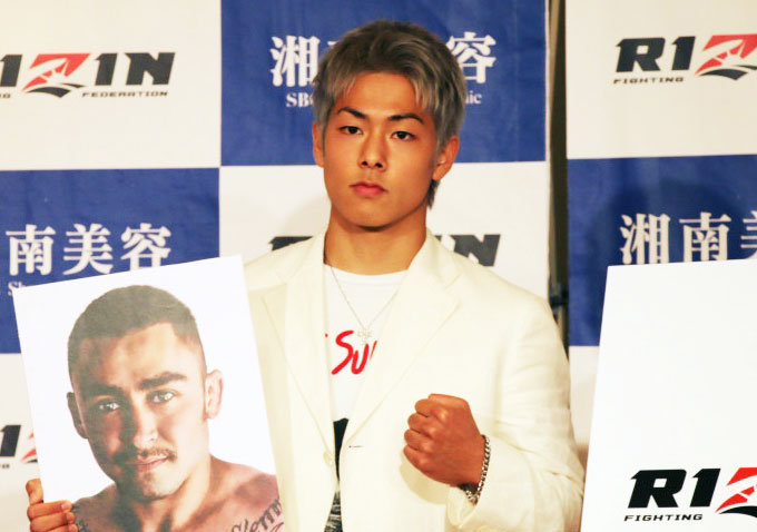 三浦孝太(先日の会見写真、パネルは対戦相手のマソーニ)