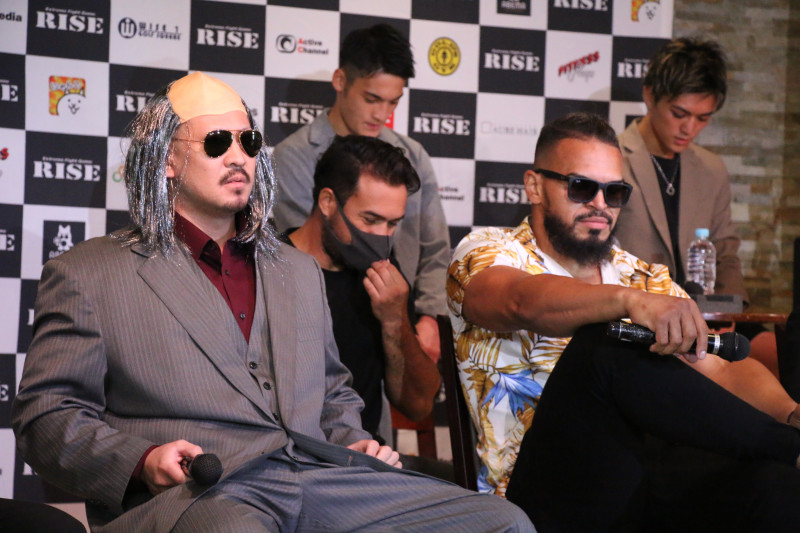 落ち武者風のカツラで登場したMAX吉田(左)は、ギブレイン(右)を挑発