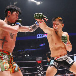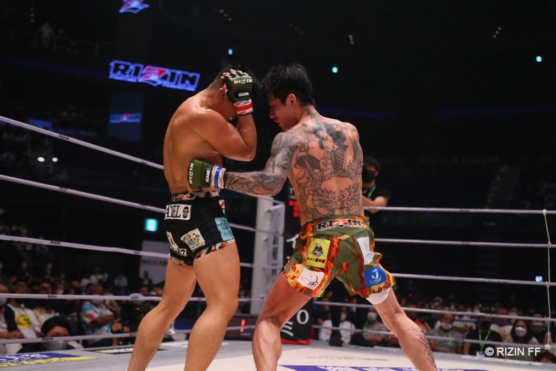 平本のボディブローが鈴木のボディに食い込む