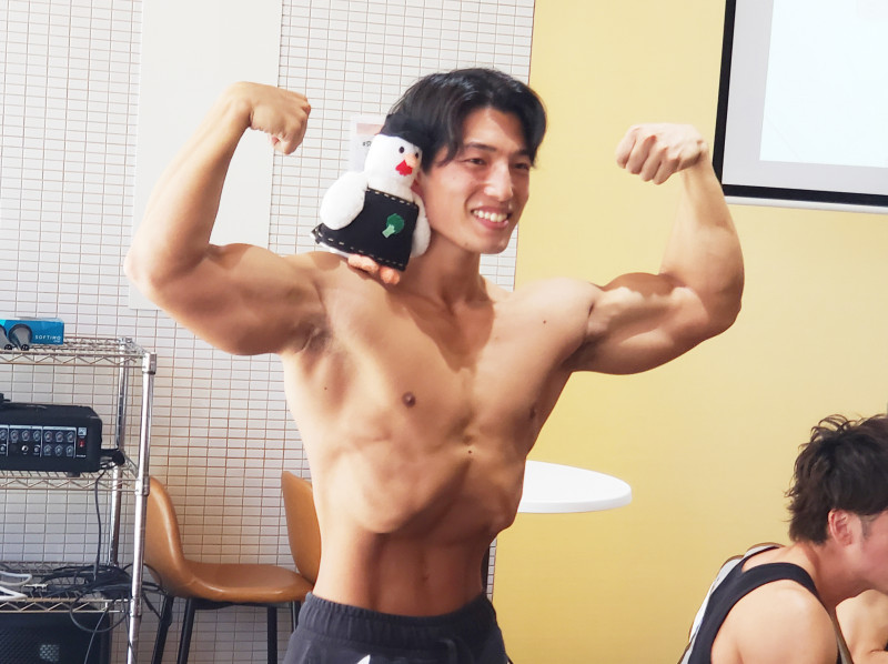 鶏むね肉とブロッコリーを食べたフィジーク選手がマッスルポーズ