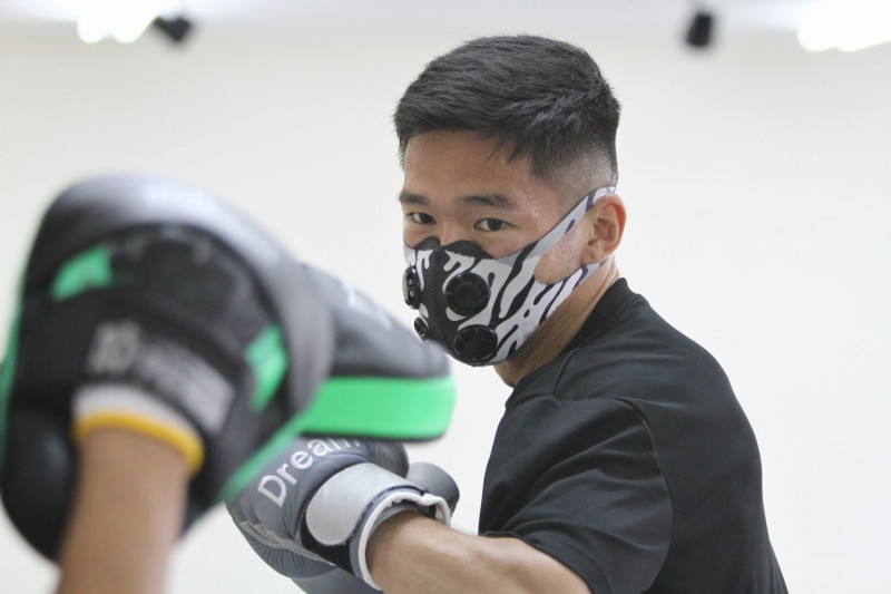篠原はマスクで呼吸を制限してパンチを強打するミット打ちも行う(C)K-1