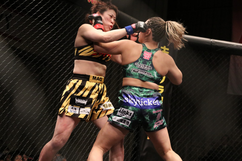 KINGレイナと対戦したウエダのデビュー戦(左/2019年3月)
