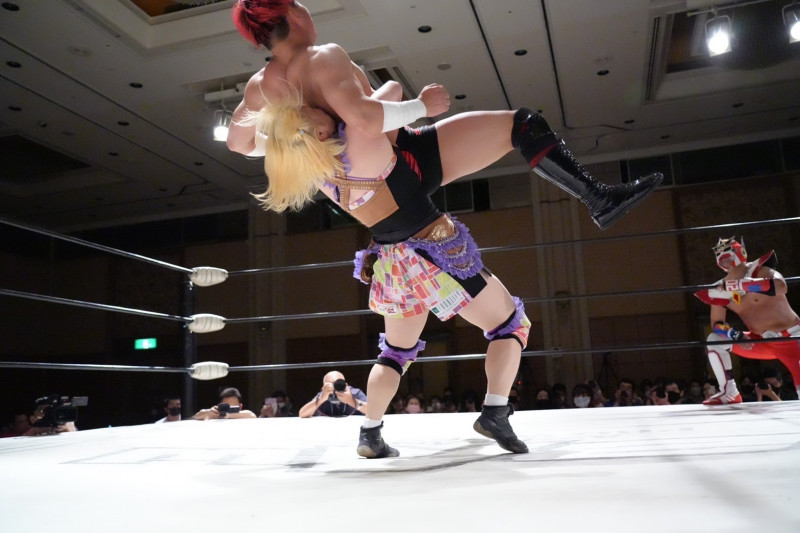 男子選手をパワフルに投げ放つ笹村(写真提供:2AW)