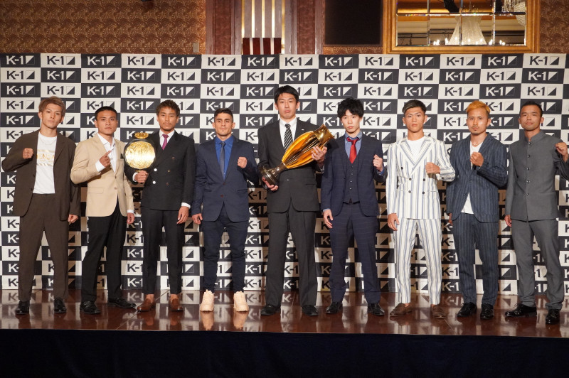 トーナメント本戦に参戦する8選手 (左から)玖村、ジャオスアヤイ、軍司、スアレス(中央)中村プロデューサー(右から)ワン、新美、斗麗、椿原