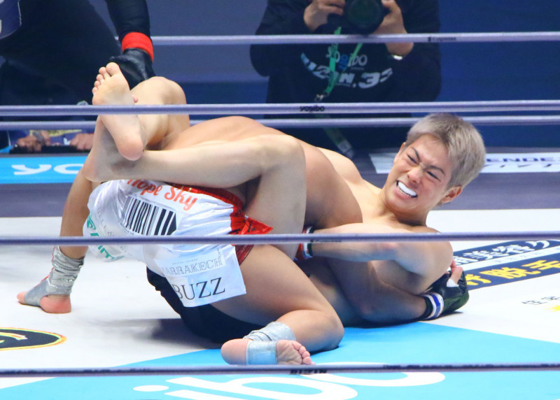 フロントチョークで相手の首を絞り上げる三浦