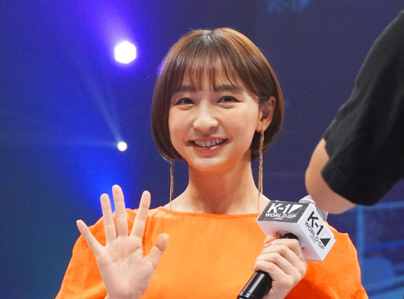 リング上の記念撮影で手を振る篠田