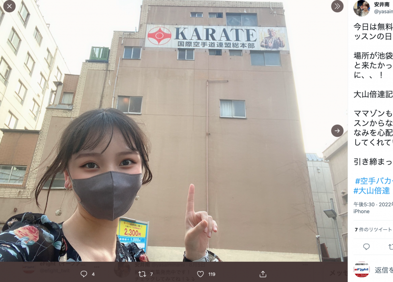 安井が極真旧総本部前に立ち寄り記念撮影(安井南Twitter提供)