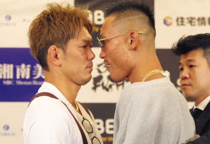 会見で睨み合う皇治(左)とヒロキング