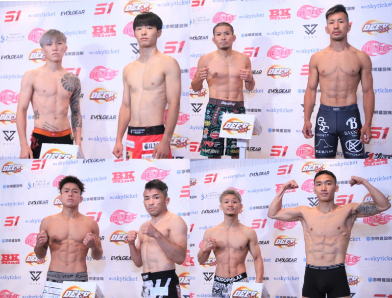フライ級GP1回戦4試合。伊藤裕樹vs原虎徹(左上)、安谷屋智弘vs小川 徹(右上)、本田良介vs越智晴雄(左下)、渋谷カズキvsビョン・ジェウン(右下)