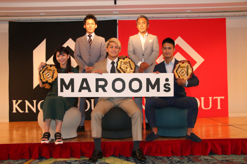 スポンサーの看板を持ちながら、前列左からぱんちゃん璃奈、鈴木千裕、重森陽太。後列左から総合演出のマイアミ啓太氏、宮田プロデューサー