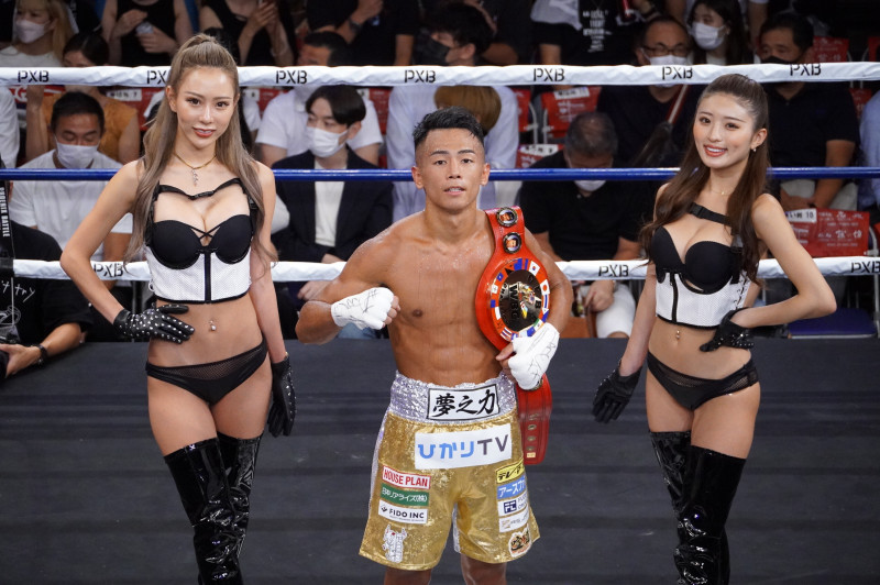 サイバージャパンダンサーズのHARACHAN(原ちゃん・左)とMIYABI(右)が武居戦(中央)のラウンドガールを務めた
