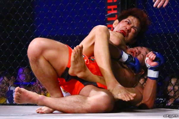 鬼の形相で相手の首を絞め上げる砂辺(上/2016年12月)