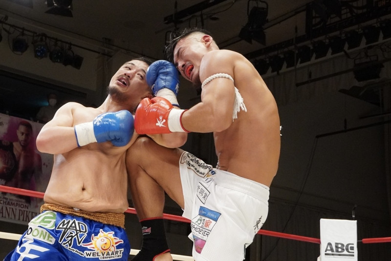 顔面へのヒザ蹴りで対抗する神保(右/2022年5月)