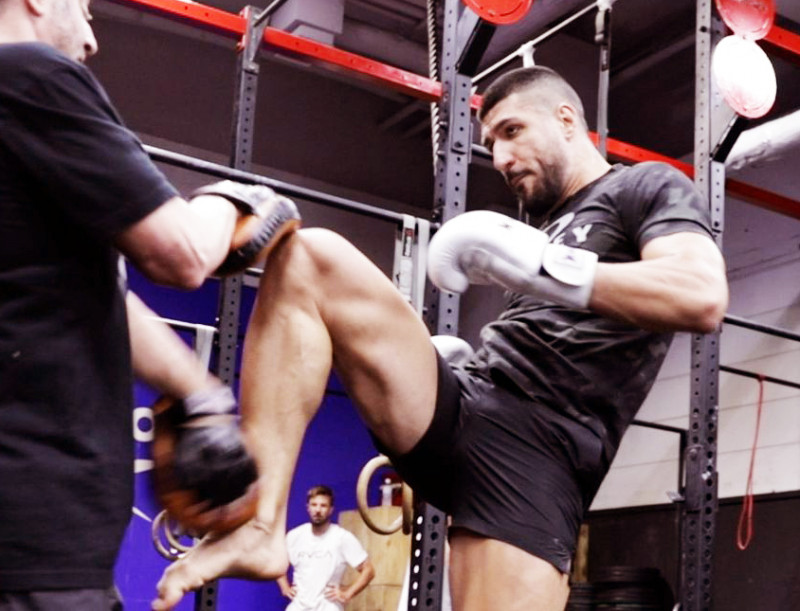 ペタス氏の持つミットにヒザ蹴りを入れるカリミアン(右)©️K-1